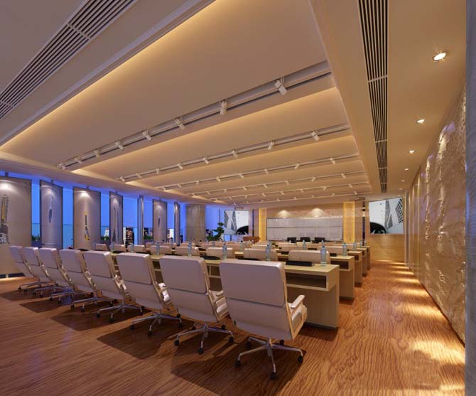 在單位裝飾中,裝飾公司沒有采納傳統的吊頂方式,而是用新式的格柵吊頂進行單位的吊頂裝飾,即與公司特色相結合,又經過線條指引的效果將工作空間進行合理的區分。